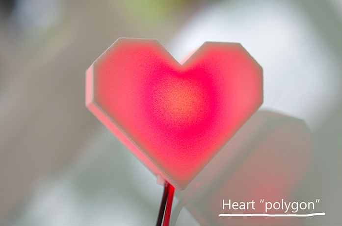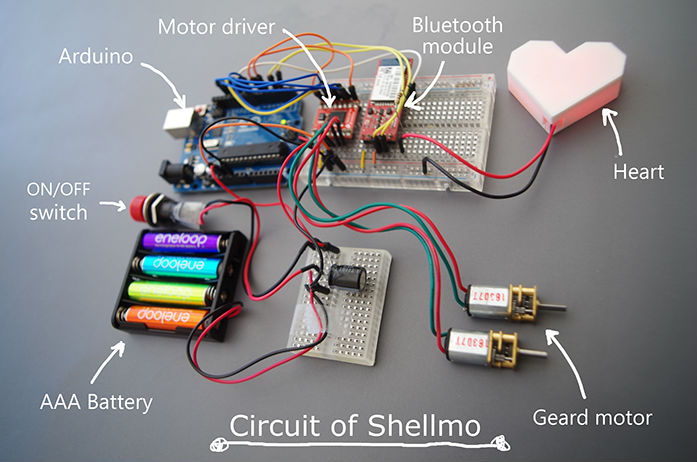 When power is turned on Shellmo, the LED which has been built into the heart will flicker periodically. I represent this "heart rate". The period of the heart rate will change, depending on conditions. By grasping this change, we will be able to obtain information from Shellmo
